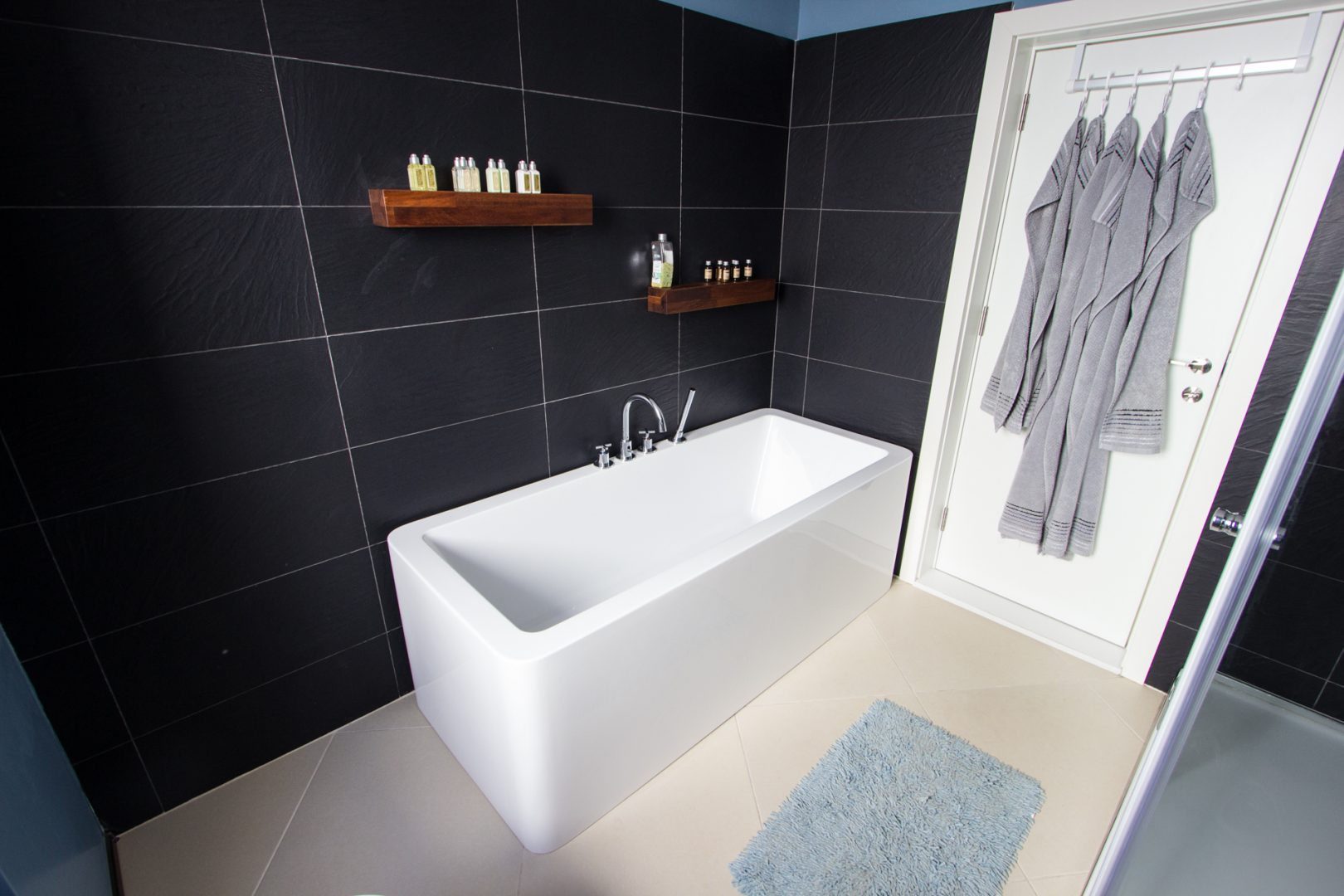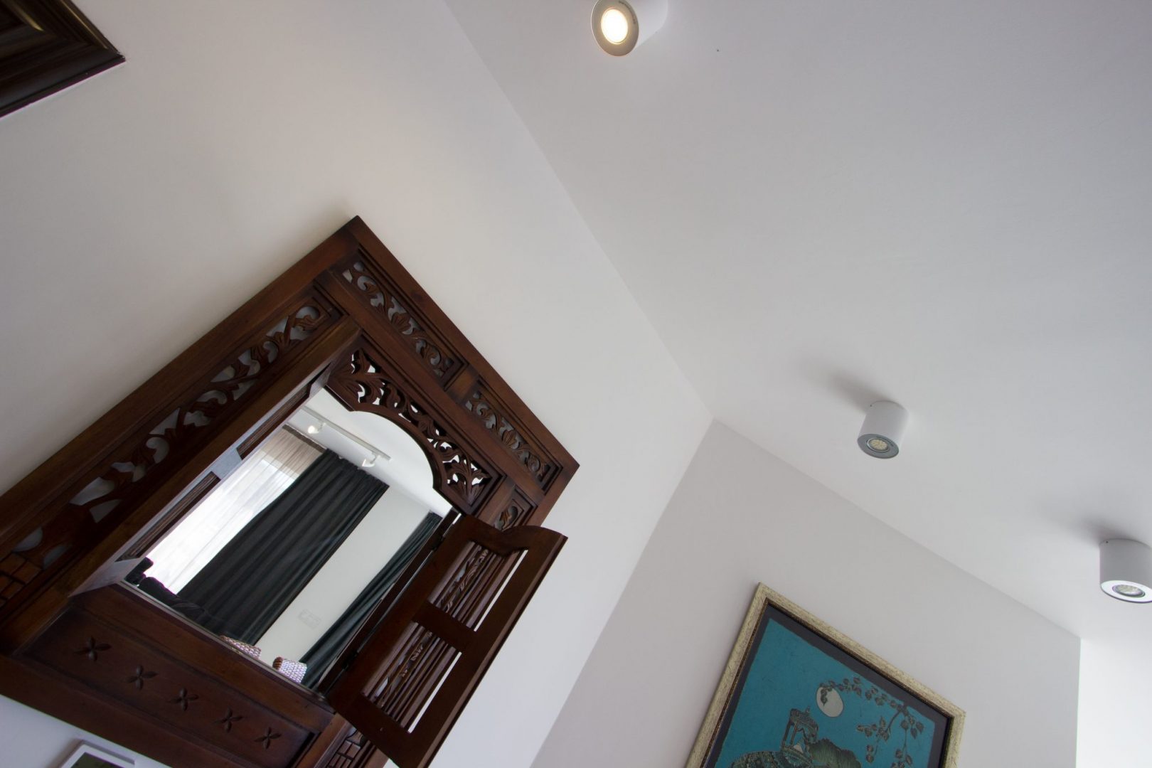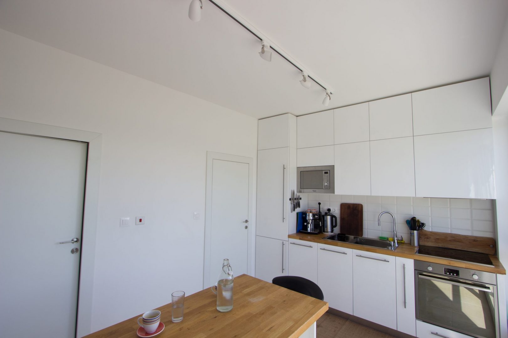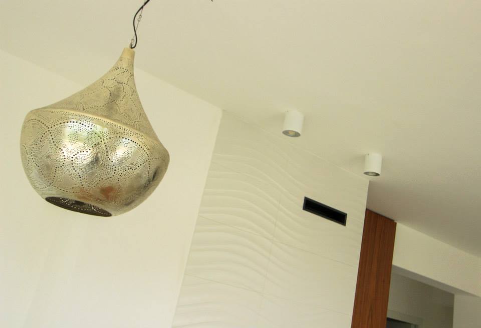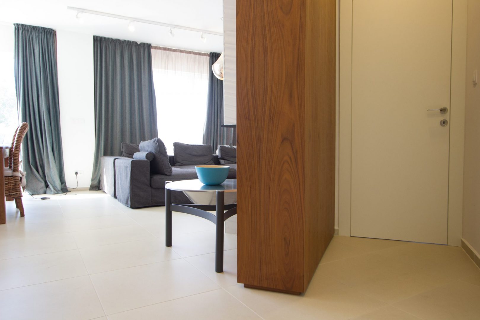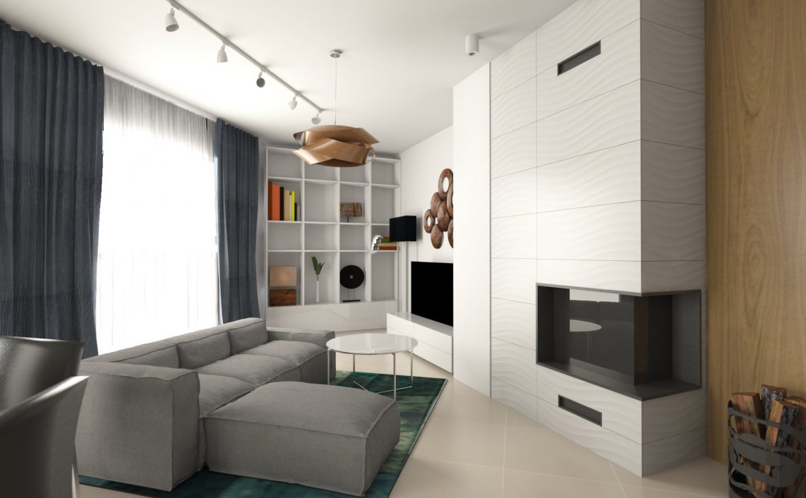 Основна идея на проекта беше да разработим модерно ваканционно убежище за собствениците – младо пътуващо семейство с динамичен начина на живот. Решихме да създаден балансирана и спокойна атмосфера, предоставяща комфорт и възможност за почивка. За да оформим пространство за умствена и физическа релаксация подбрахме земни пясъчни тонове за подовите настилки, а за акцент на някои стени предпочетохме стенни облицовки от дърво. Смесихме всичко това с натурални текстури и изчистени линии – бежово, бяло, светло кафеви цветове, гланцови повърхности и хромирани детайли. За мокрите помещения избрахме оловно син цвят в комбинация с магма и графит. Ключови материали, които използвахме са естествен дъб и ироко, фурнирован МДФ, хром. Оборудвахме дневната с камина, за да засилим усещането за спокойствие, топлина и уют.