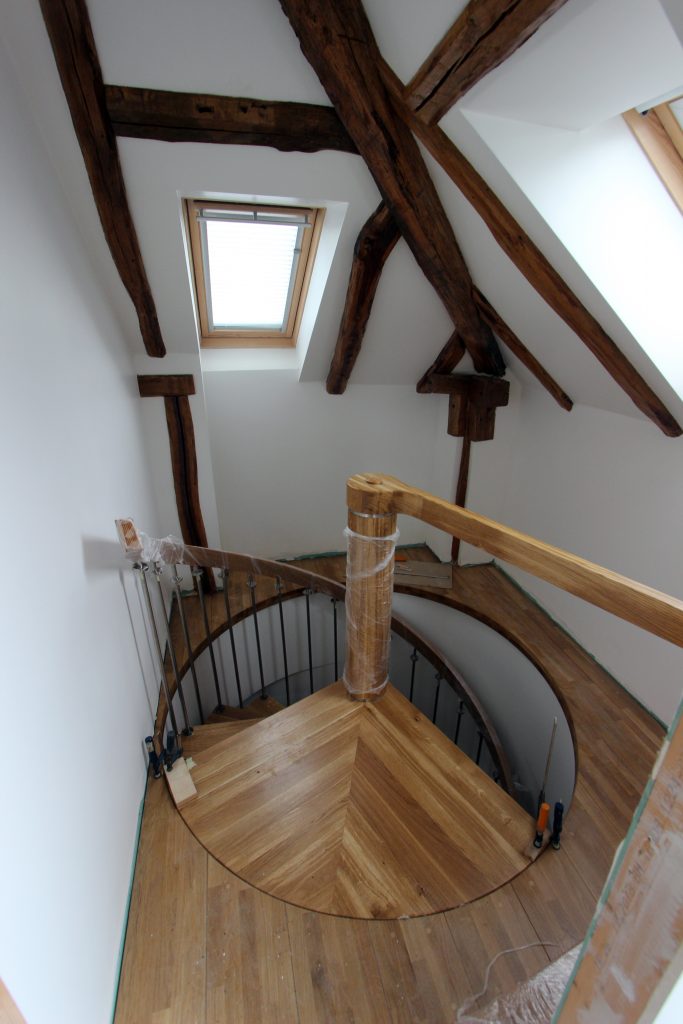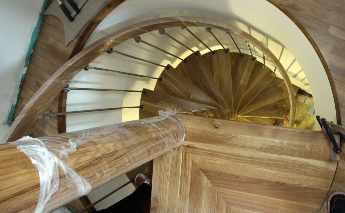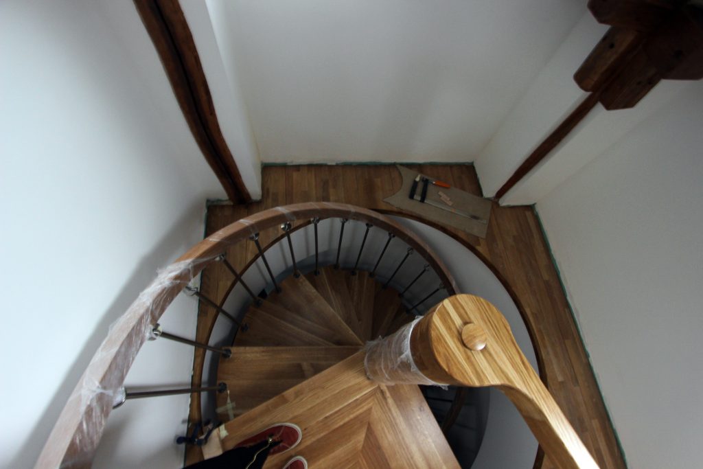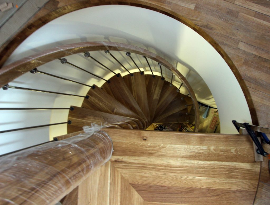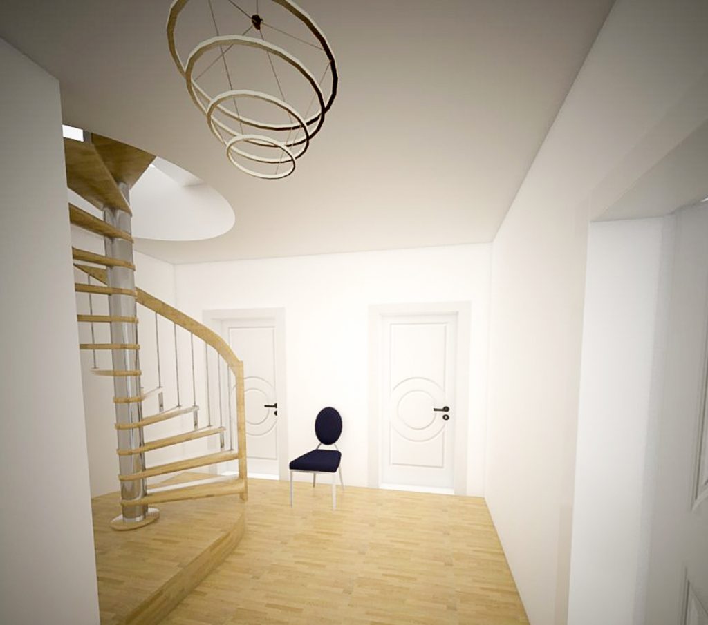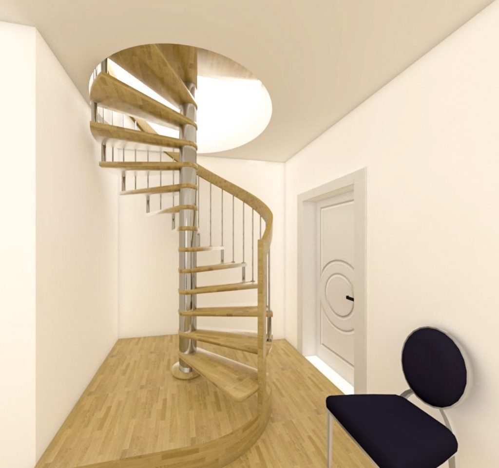 Заданието се състоеше в обединяването на двуетажна къща с таванското и пространство, където е оформен самостоятелен апартамент с прилежащи кухня и баня. По изискване на клиента за стъпалата и площадките използвахме клинозвъбноснадени дъбови плочи и хромирани шпиндли за перилата. Акцентът пада върху шарките на дървото и натуралните му характеристики и създава богат топъл ефект и елегантност. Спираловидното стълбище е красив акцент в интериора на цялата къща.