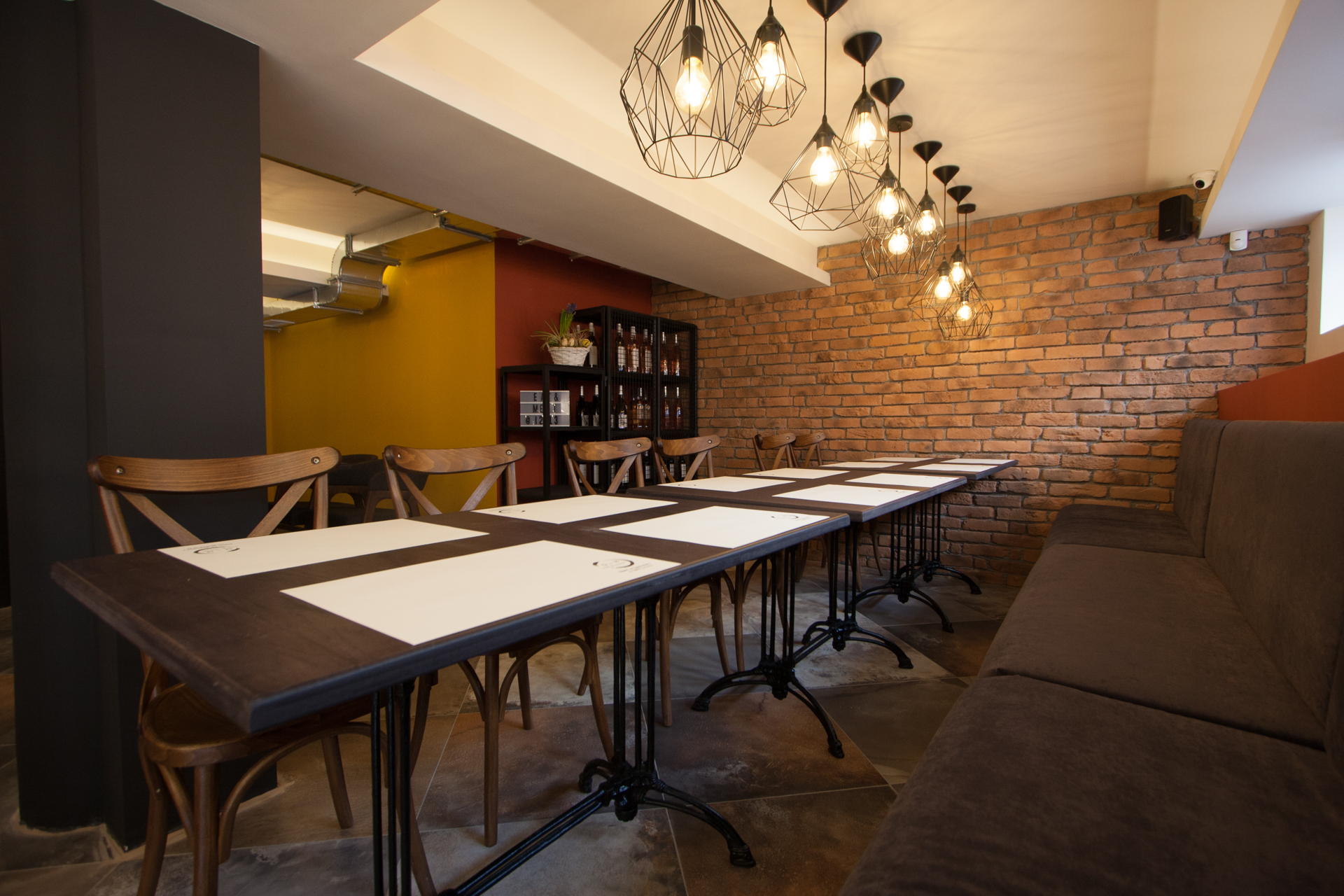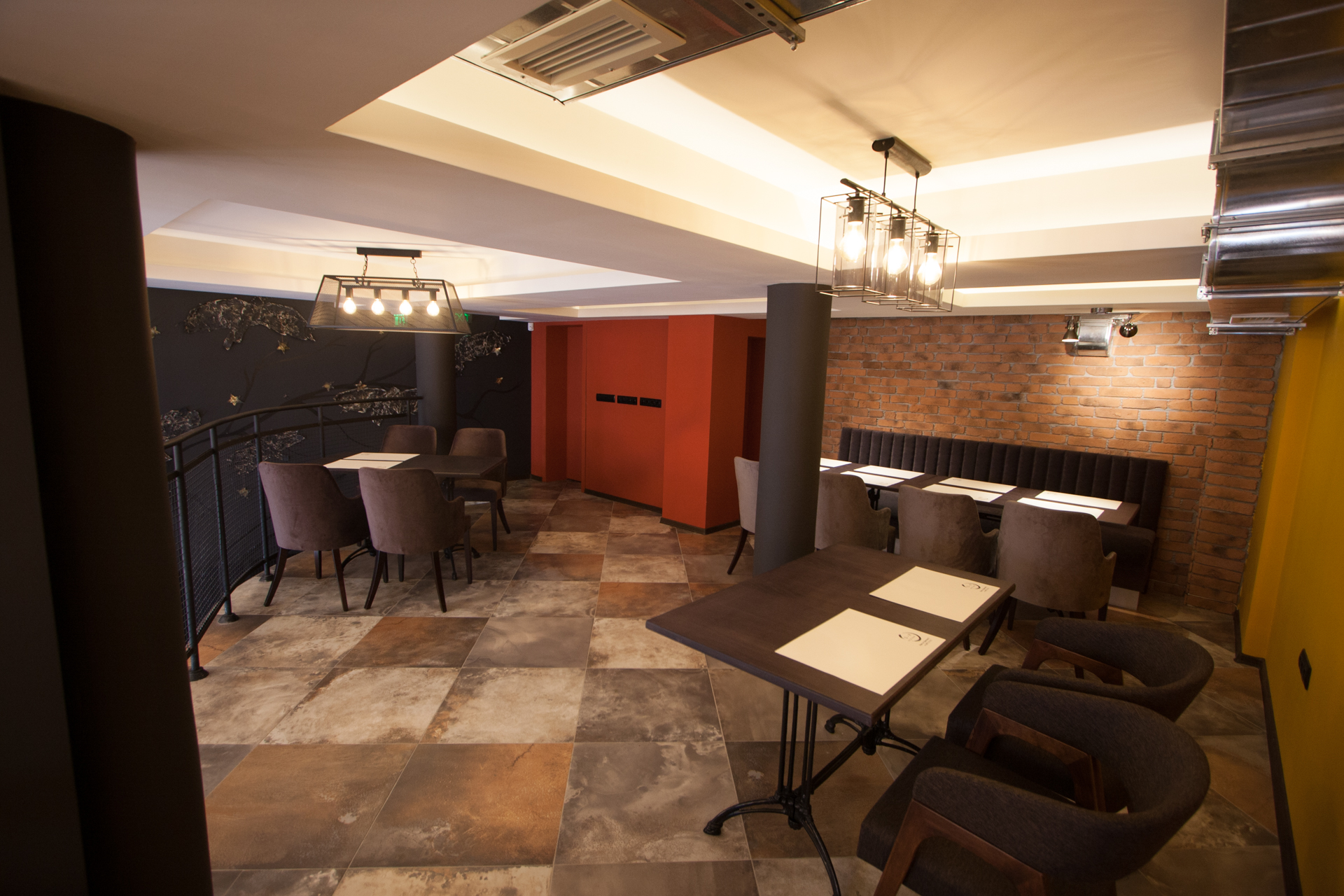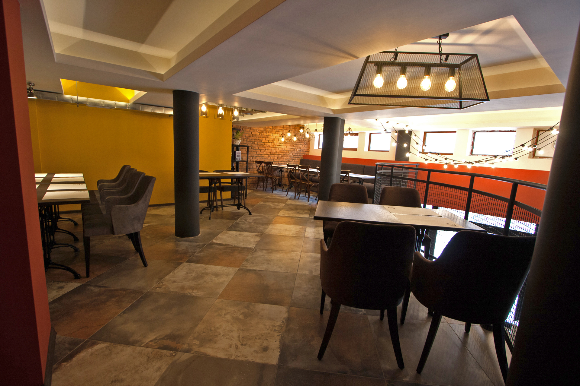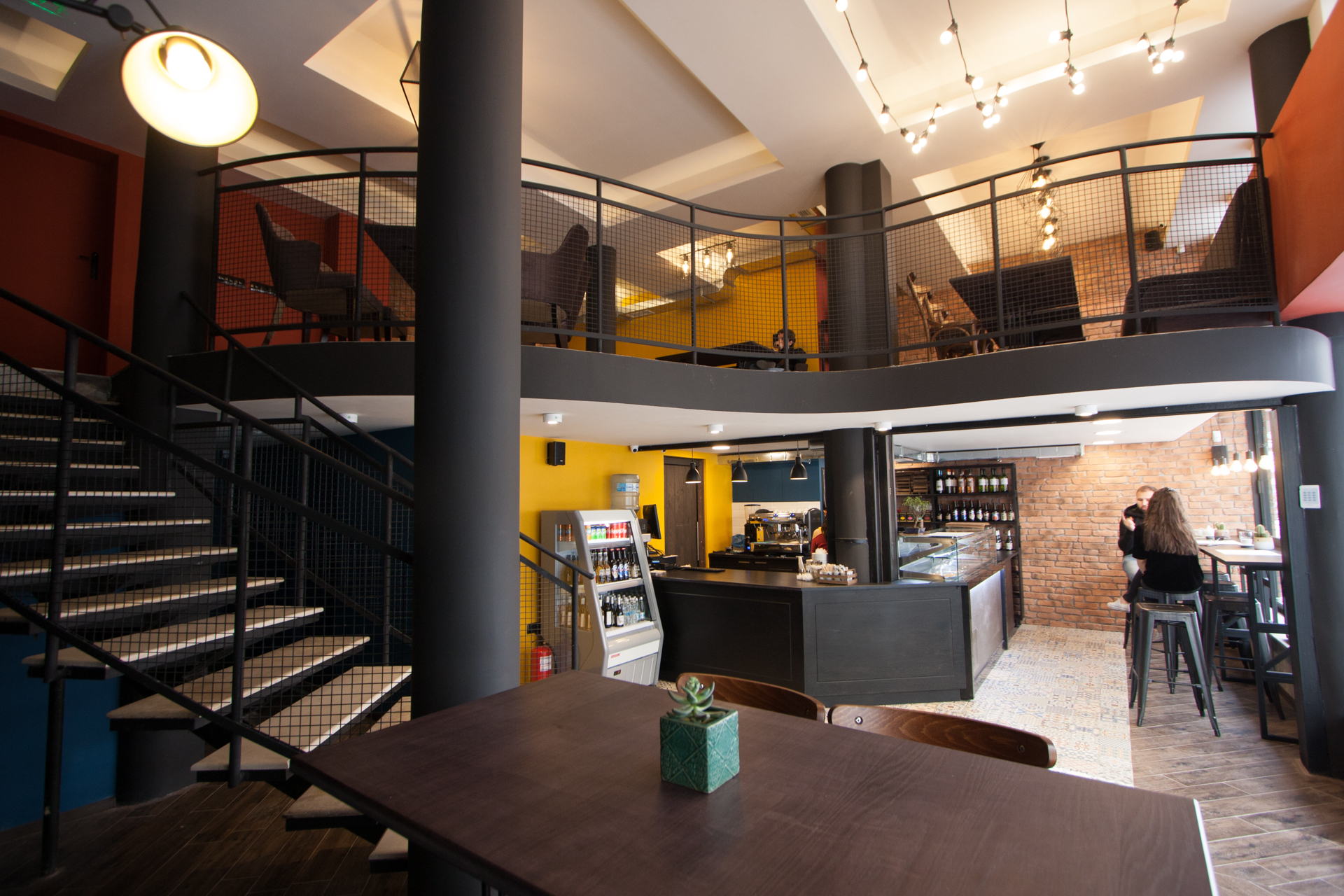 The project main task was to do complete interior design and renovation of two leveled retail space – restaurant serving delicious specialties. Clients requirements were inspired of the mixture between industrial and vintage style. To fulfill the concept we left visible the existing steel beams and concrete columns, added exposed bricks as a wall covering, industrial luminaries, railings made of metal pipe profiles and mesh and dark solid wood. The color palette was composed to provide strong contrast of the industrial details and also to bring comfort and coziness – yellow mustard tones that allows other furniture and equipment to pup up, sangria red shade to increase appetite, accent touches of green-blue and graphite- black wall as large artistic accent and focal point of the whole space. The ceramic floor coverings of the first level are fresh and inviting – diagonally distributed oak wood planks in combination with azulejo tiles surrounding the cash desk zone. The second level floors blend the shades of old rusted metal and fuse the warm light coming of the lighting fixtures.