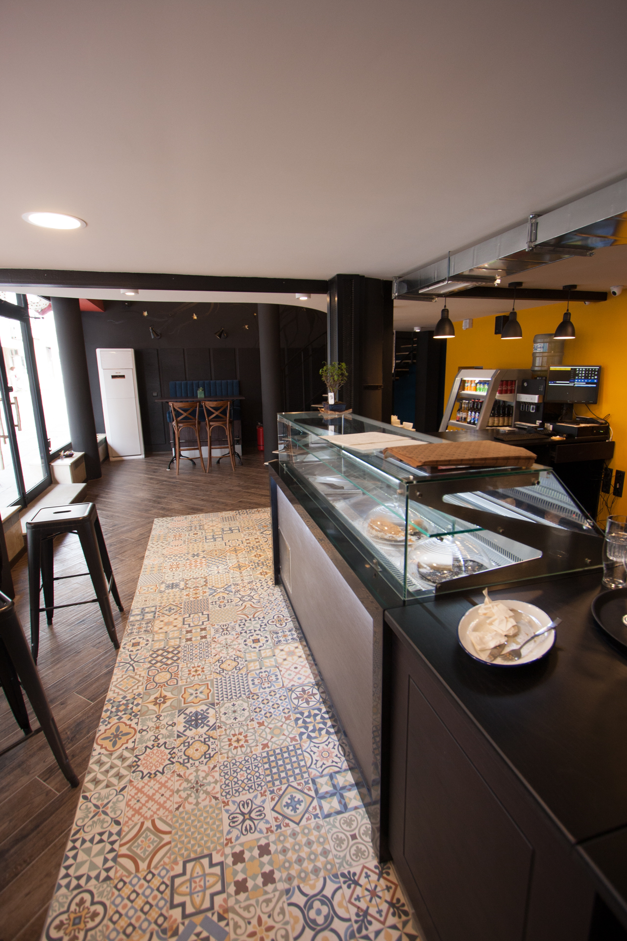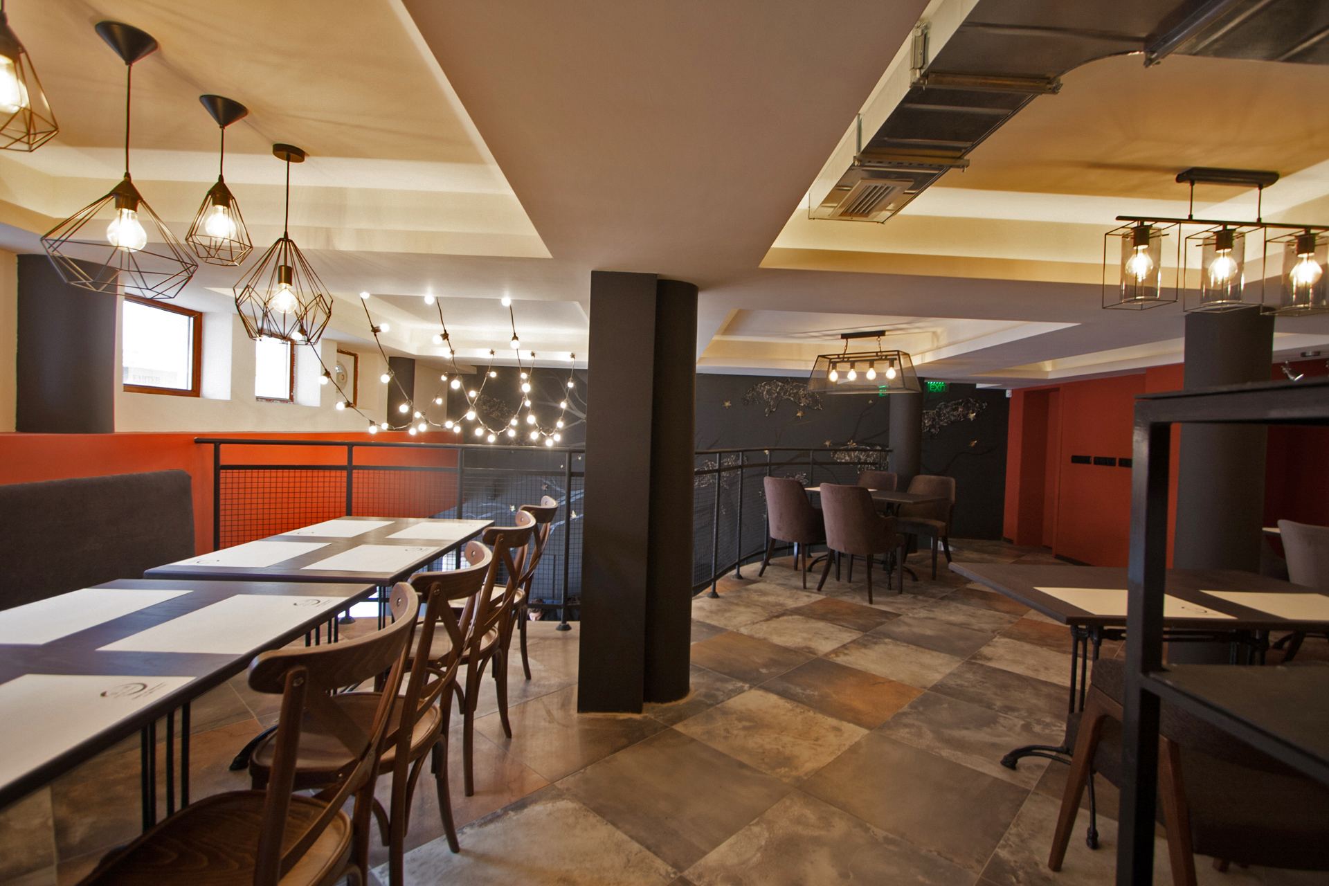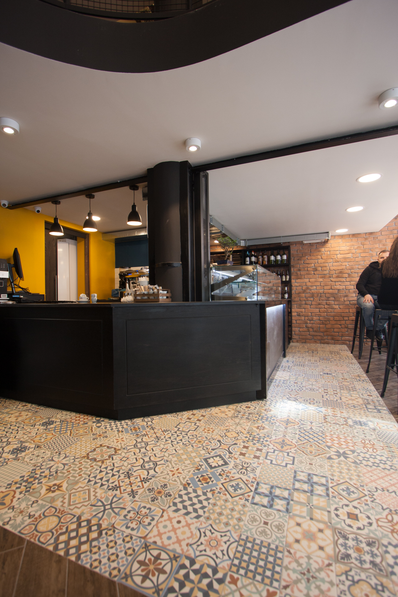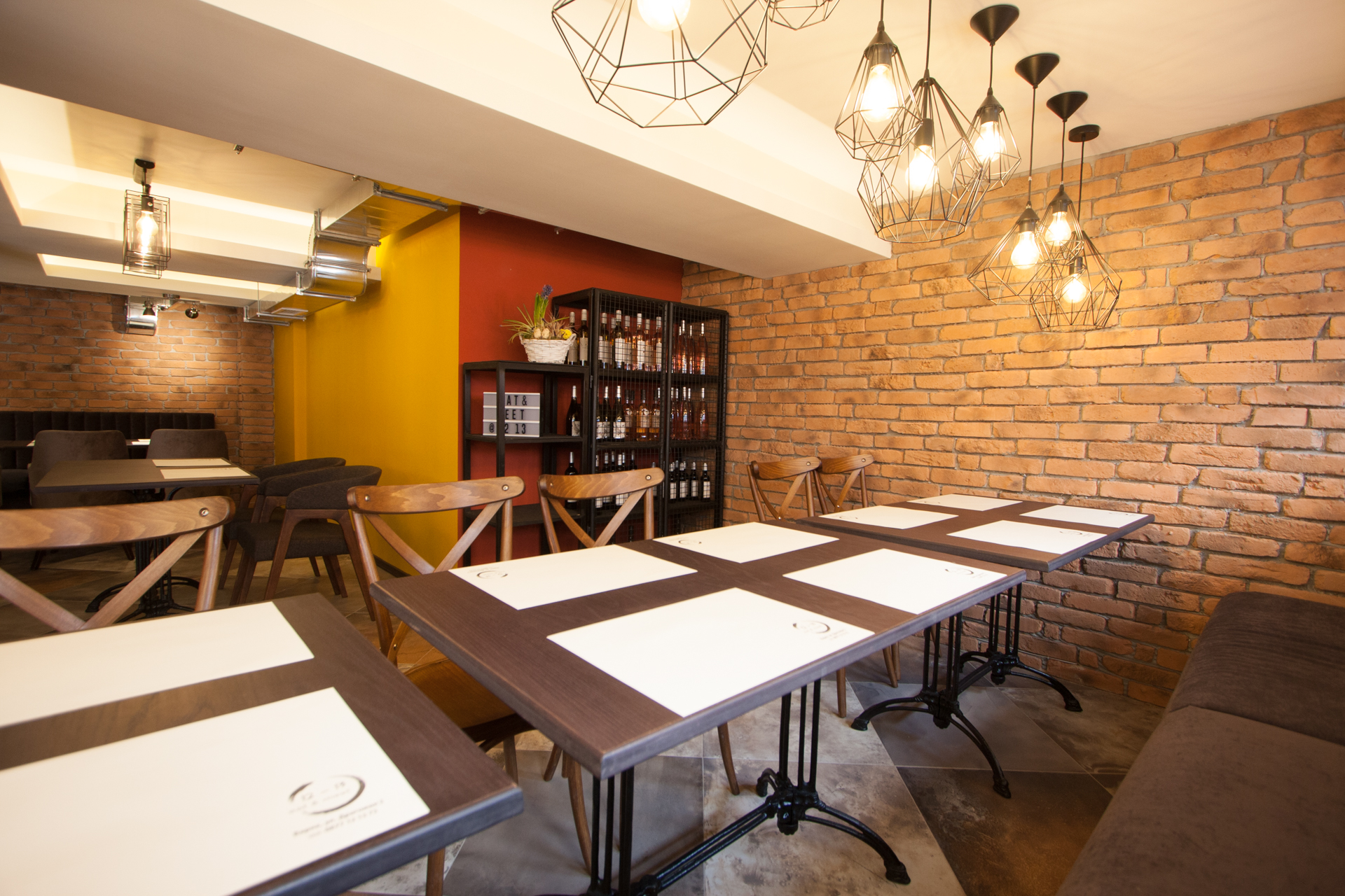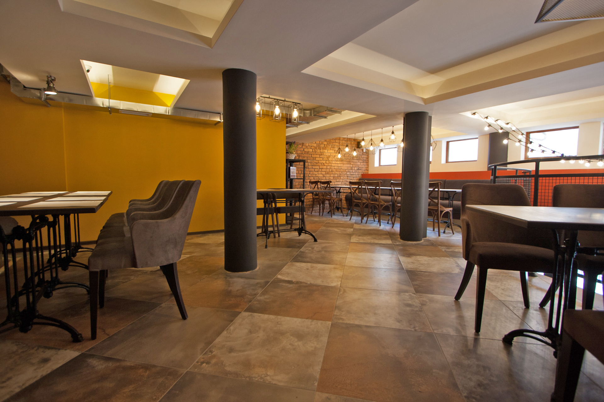 The project main task was to do complete interior design and renovation of two leveled retail space – restaurant serving delicious specialties. Clients requirements were inspired of the mixture between industrial and vintage style. To fulfill the concept we left visible the existing steel beams and concrete columns, added exposed bricks as a wall covering, industrial luminaries, railings made of metal pipe profiles and mesh and dark solid wood. The color palette was composed to provide strong contrast of the industrial details and also to bring comfort and coziness – yellow mustard tones that allows other furniture and equipment to pup up, sangria red shade to increase appetite, accent touches of green-blue and graphite- black wall as large artistic accent and focal point of the whole space. The ceramic floor coverings of the first level are fresh and inviting – diagonally distributed oak wood planks in combination with azulejo tiles surrounding the cash desk zone. The second level floors blend the shades of old rusted metal and fuse the warm light coming of the lighting fixtures.