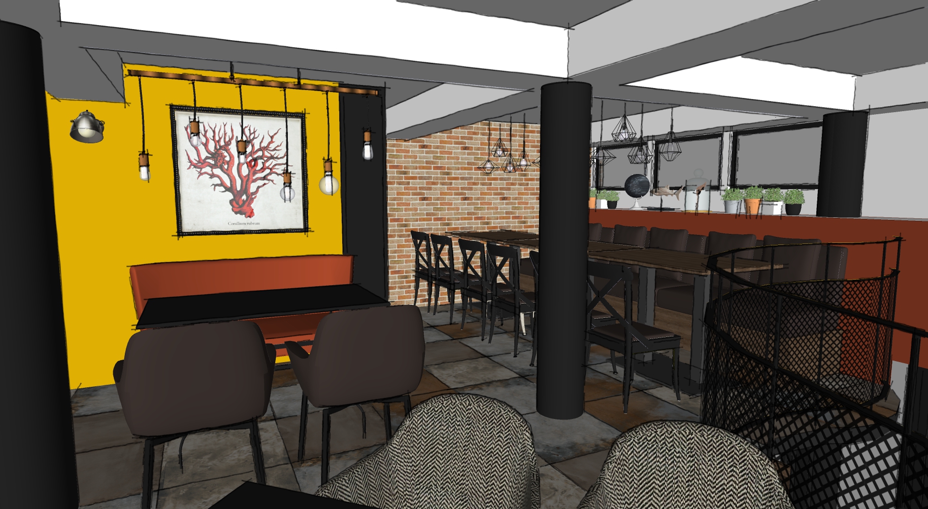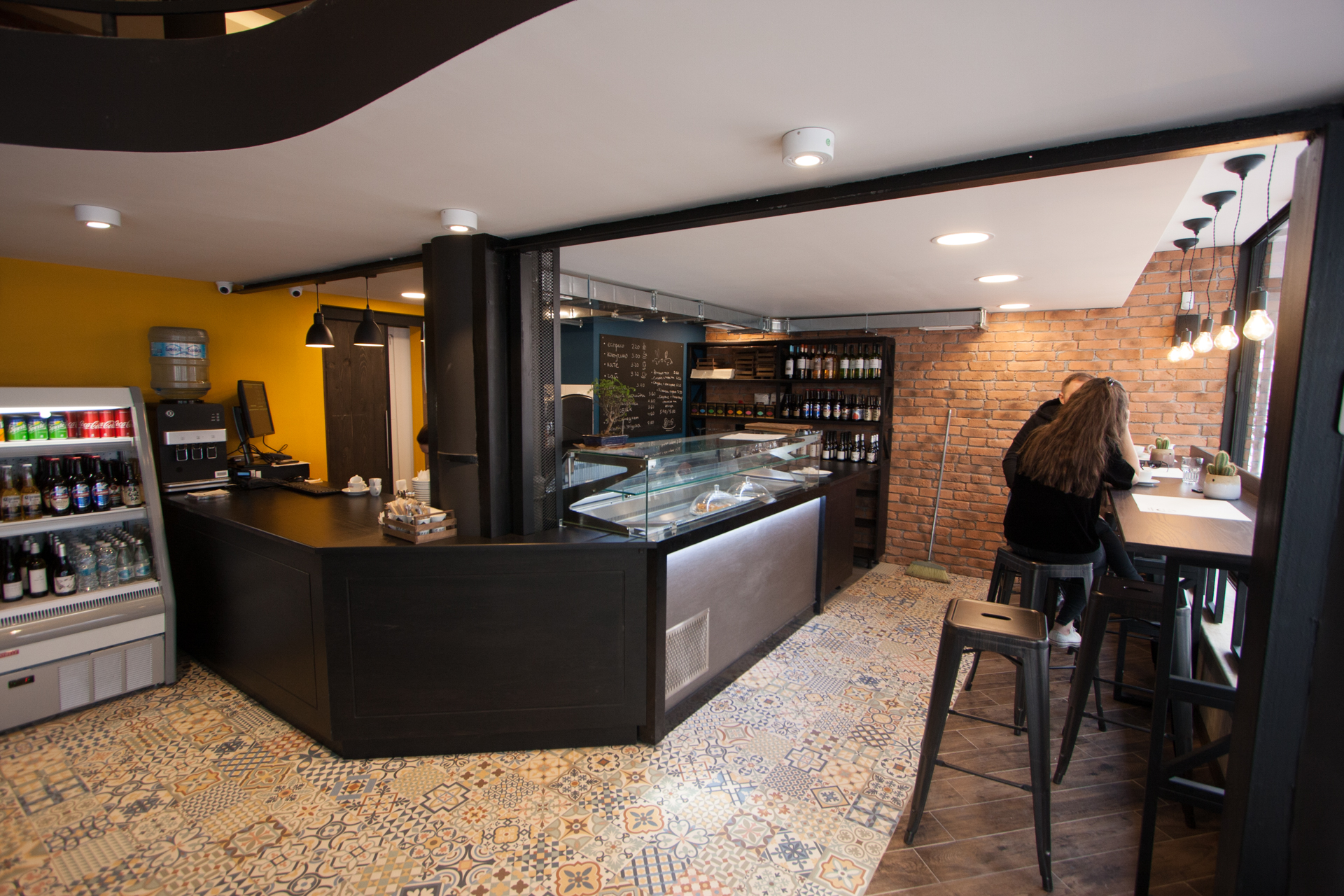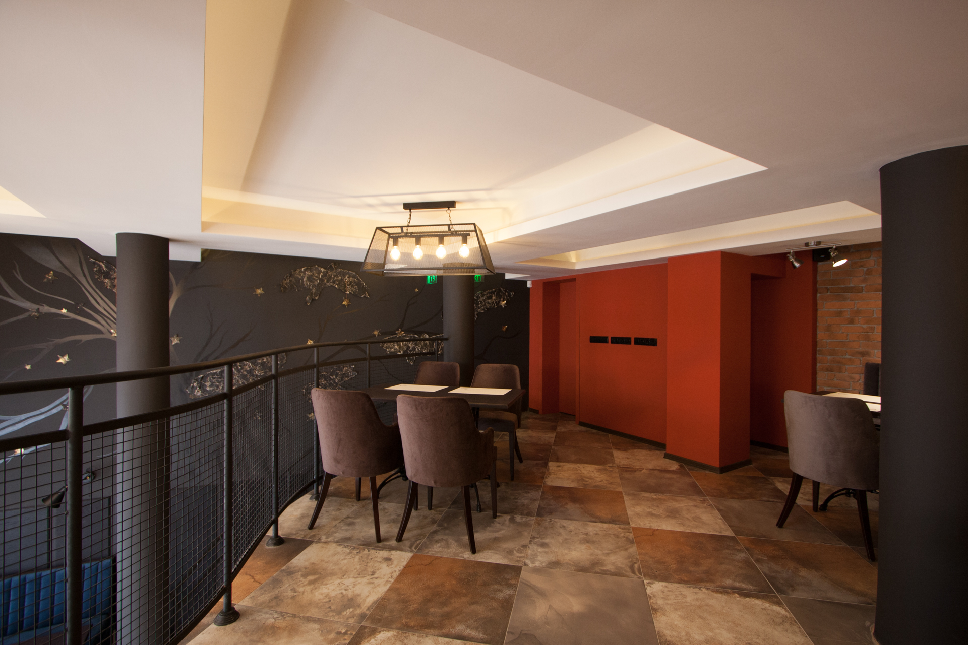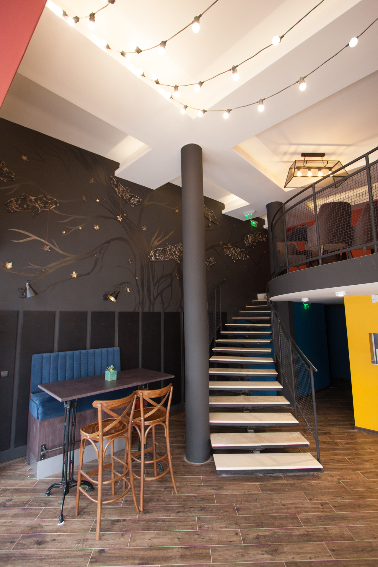 The project main task was to do complete interior design and renovation of two leveled retail space – restaurant serving delicious specialties. Clients requirements were inspired of the mixture between industrial and vintage style. To fulfill the concept we left visible the existing steel beams and concrete columns, added exposed bricks as a wall covering, industrial luminaries, railings made of metal pipe profiles and mesh and dark solid wood. The color palette was composed to provide strong contrast of the industrial details and also to bring comfort and coziness – yellow mustard tones that allows other furniture and equipment to pup up, sangria red shade to increase appetite, accent touches of green-blue and graphite- black wall as large artistic accent and focal point of the whole space. The ceramic floor coverings of the first level are fresh and inviting – diagonally distributed oak wood planks in combination with azulejo tiles surrounding the cash desk zone. The second level floors blend the shades of old rusted metal and fuse the warm light coming of the lighting fixtures.