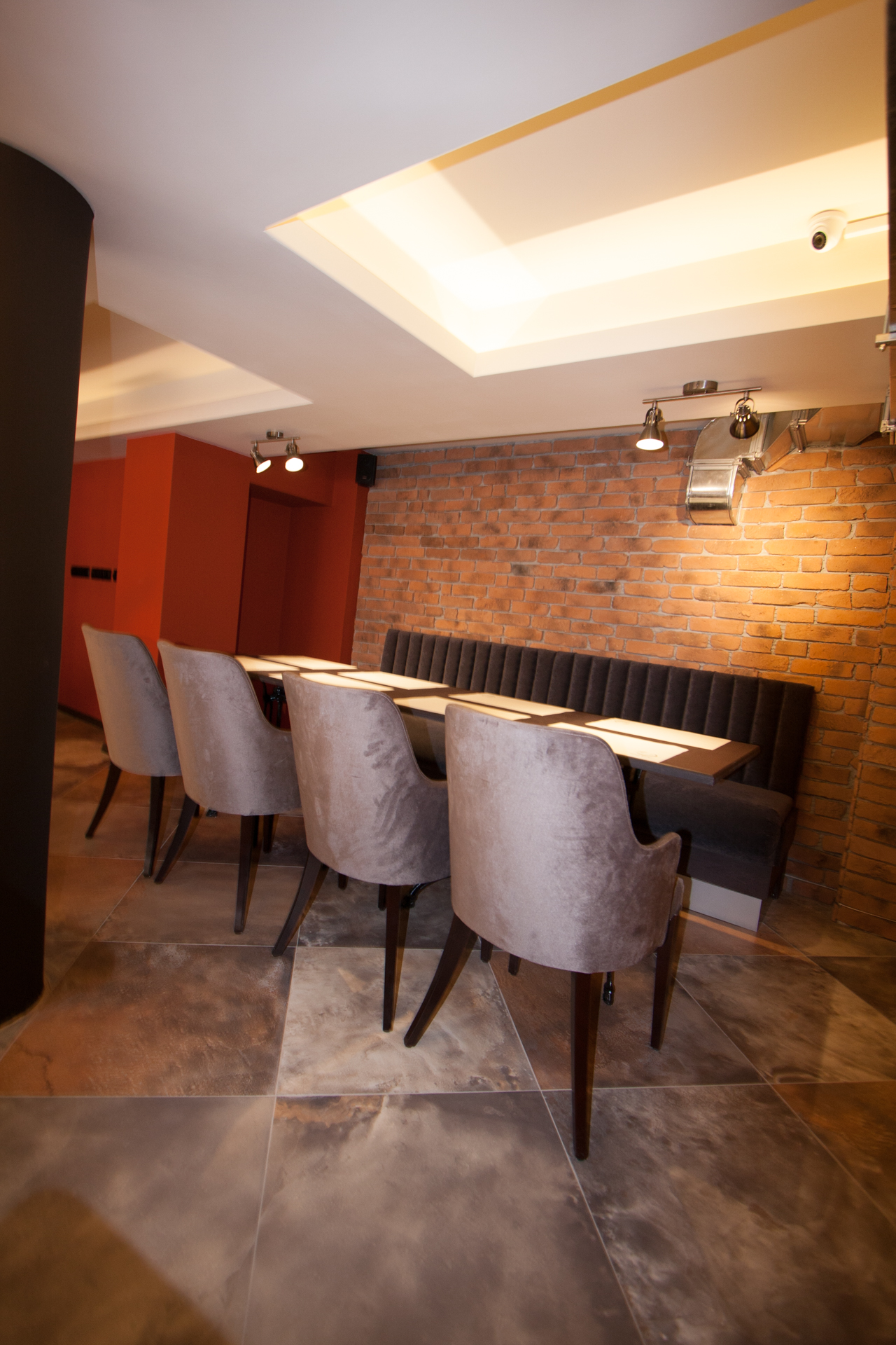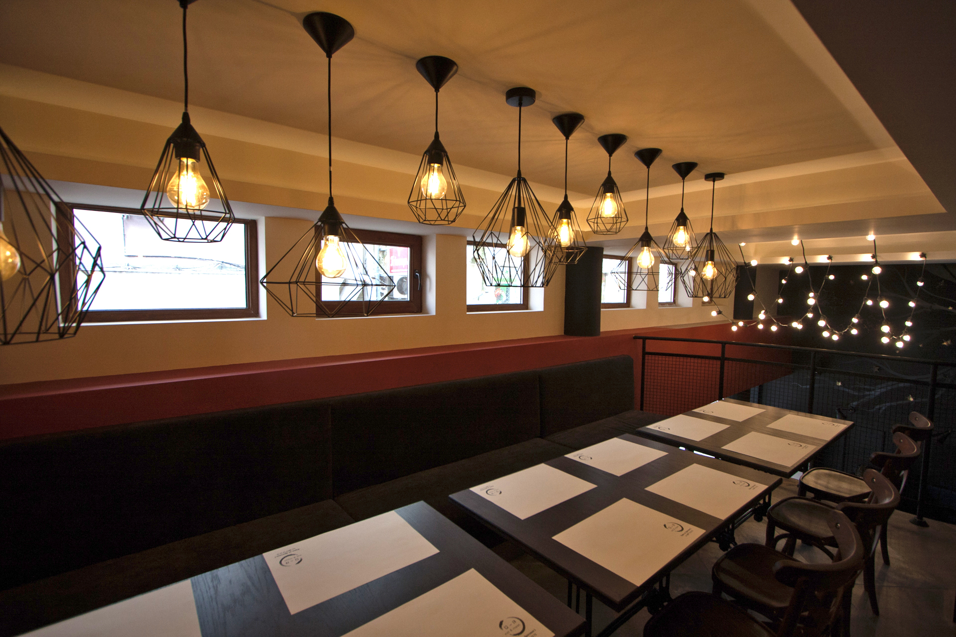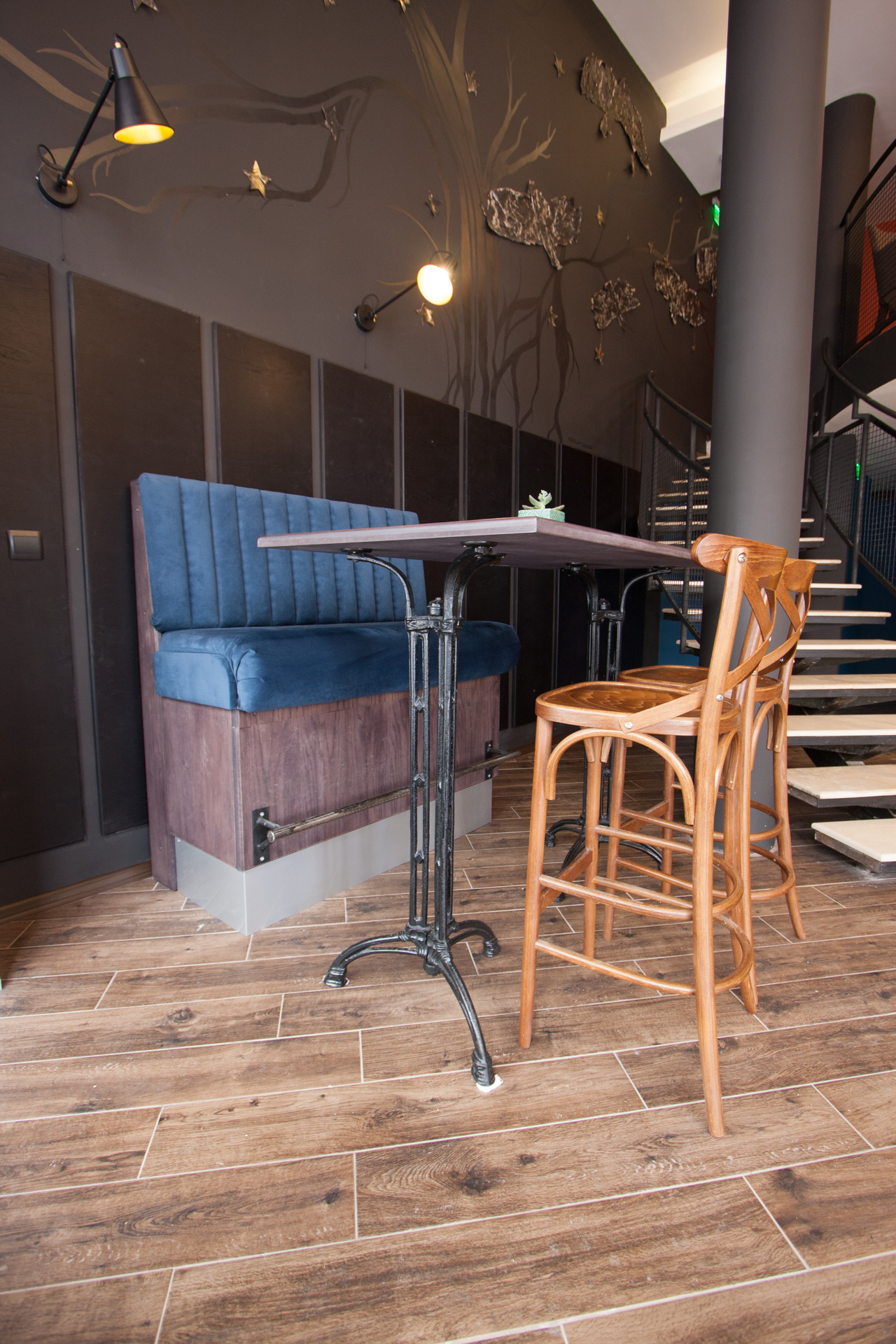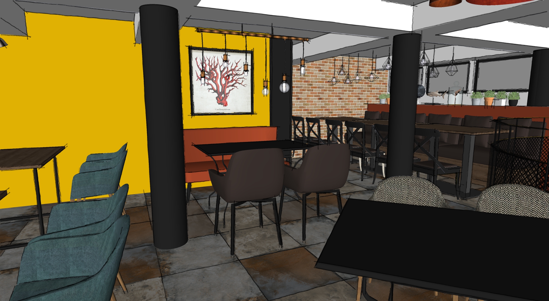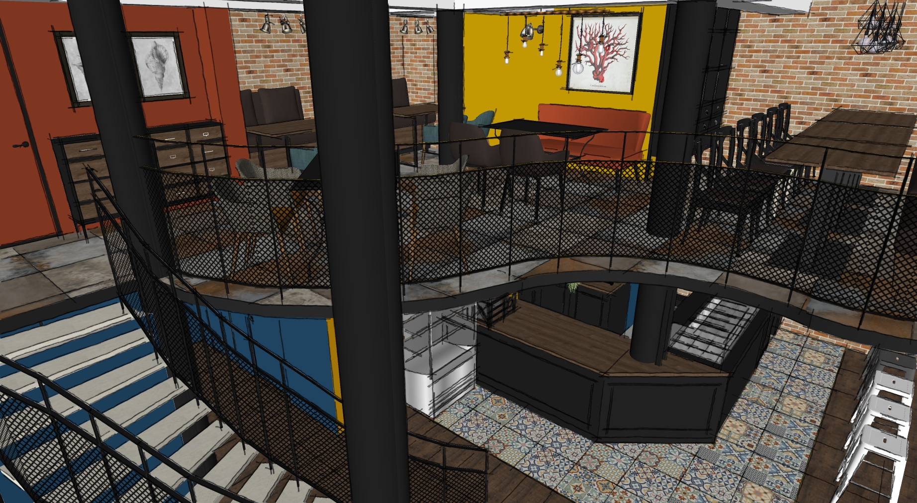 The project main task was to do complete interior design and renovation of two leveled retail space – restaurant serving delicious specialties. Clients requirements were inspired of the mixture between industrial and vintage style. To fulfill the concept we left visible the existing steel beams and concrete columns, added exposed bricks as a wall covering, industrial luminaries, railings made of metal pipe profiles and mesh and dark solid wood. The color palette was composed to provide strong contrast of the industrial details and also to bring comfort and coziness – yellow mustard tones that allows other furniture and equipment to pup up, sangria red shade to increase appetite, accent touches of green-blue and graphite- black wall as large artistic accent and focal point of the whole space. The ceramic floor coverings of the first level are fresh and inviting – diagonally distributed oak wood planks in combination with azulejo tiles surrounding the cash desk zone. The second level floors blend the shades of old rusted metal and fuse the warm light coming of the lighting fixtures.