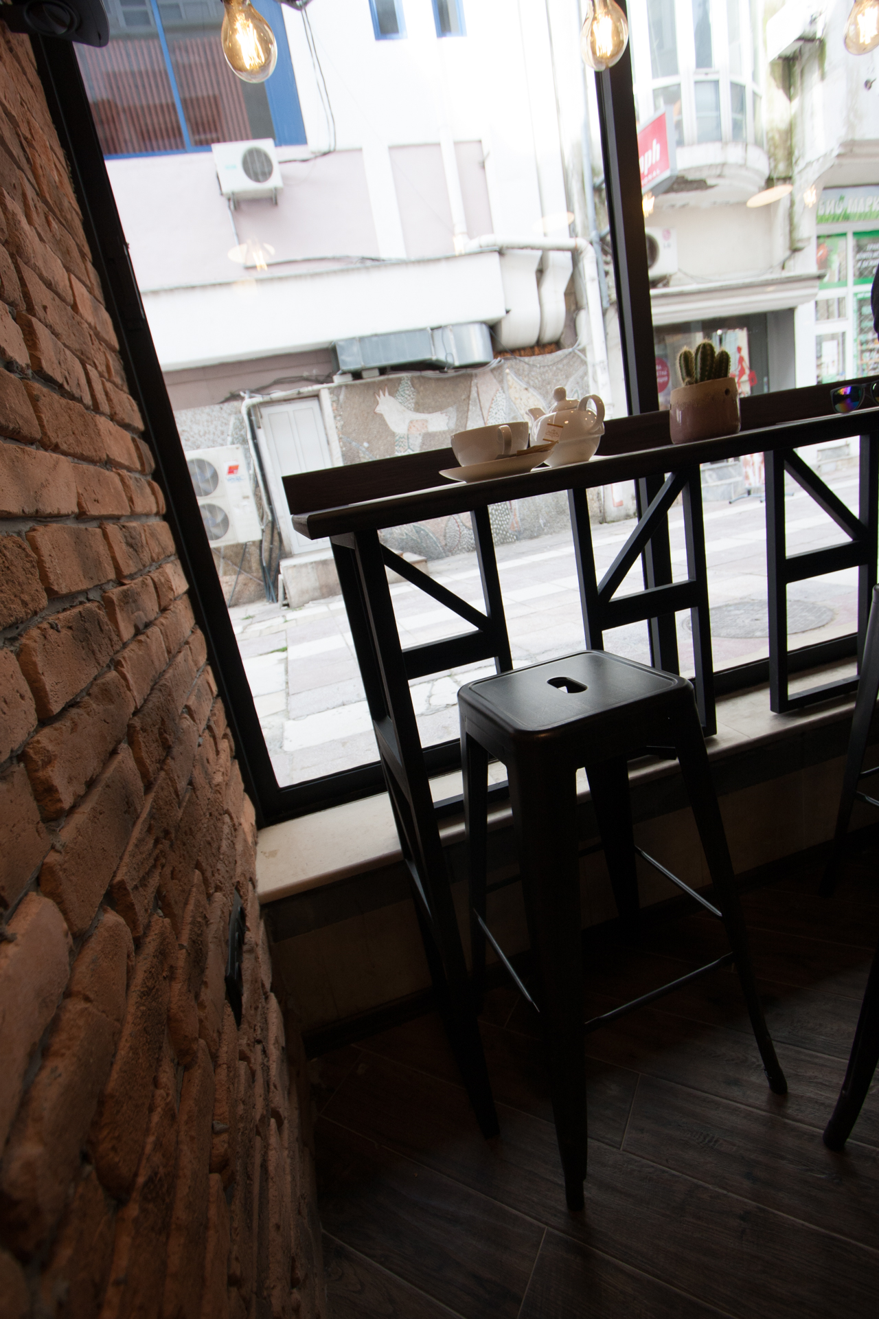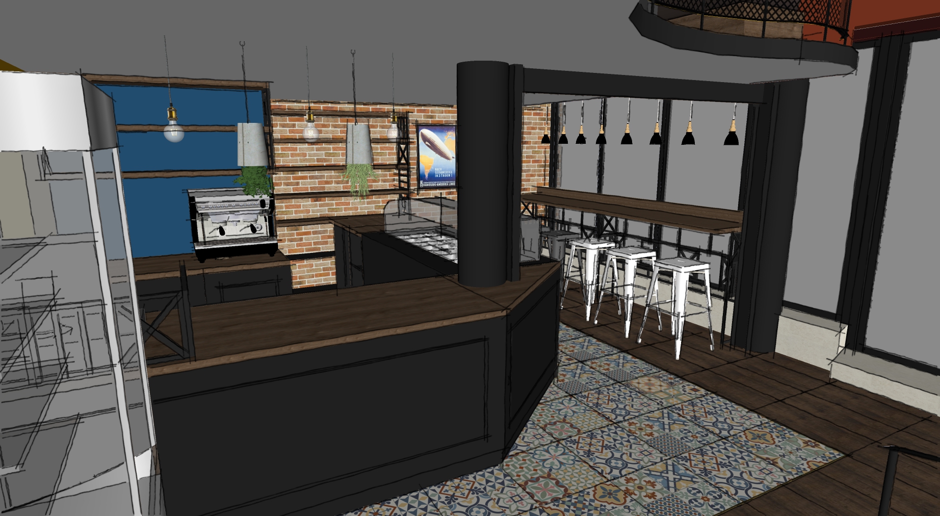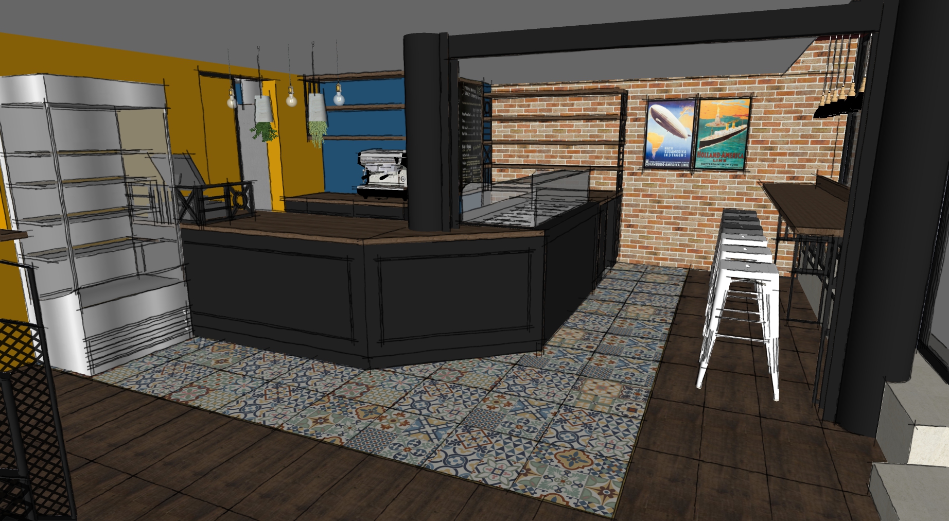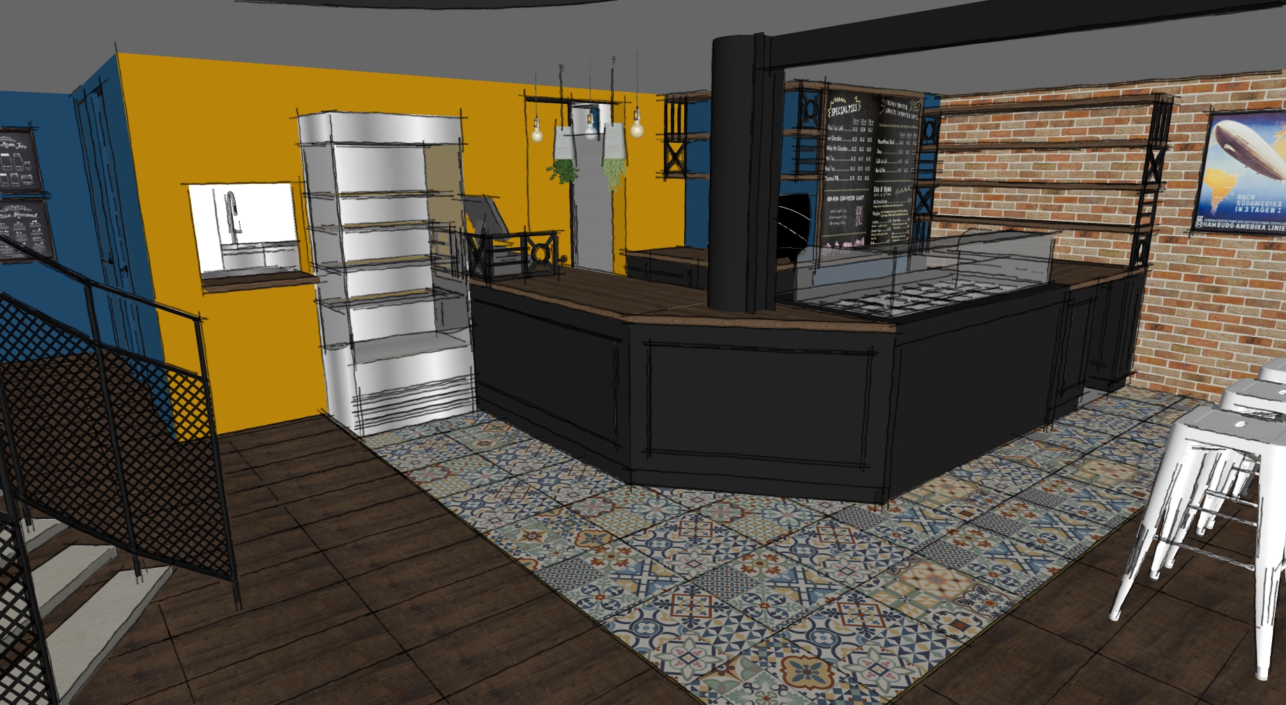 The project main task was to do complete interior design and renovation of two leveled retail space – restaurant serving delicious specialties. Clients requirements were inspired of the mixture between industrial and vintage style. To fulfill the concept we left visible the existing steel beams and concrete columns, added exposed bricks as a wall covering, industrial luminaries, railings made of metal pipe profiles and mesh and dark solid wood. The color palette was composed to provide strong contrast of the industrial details and also to bring comfort and coziness – yellow mustard tones that allows other furniture and equipment to pup up, sangria red shade to increase appetite, accent touches of green-blue and graphite- black wall as large artistic accent and focal point of the whole space. The ceramic floor coverings of the first level are fresh and inviting – diagonally distributed oak wood planks in combination with azulejo tiles surrounding the cash desk zone. The second level floors blend the shades of old rusted metal and fuse the warm light coming of the lighting fixtures.