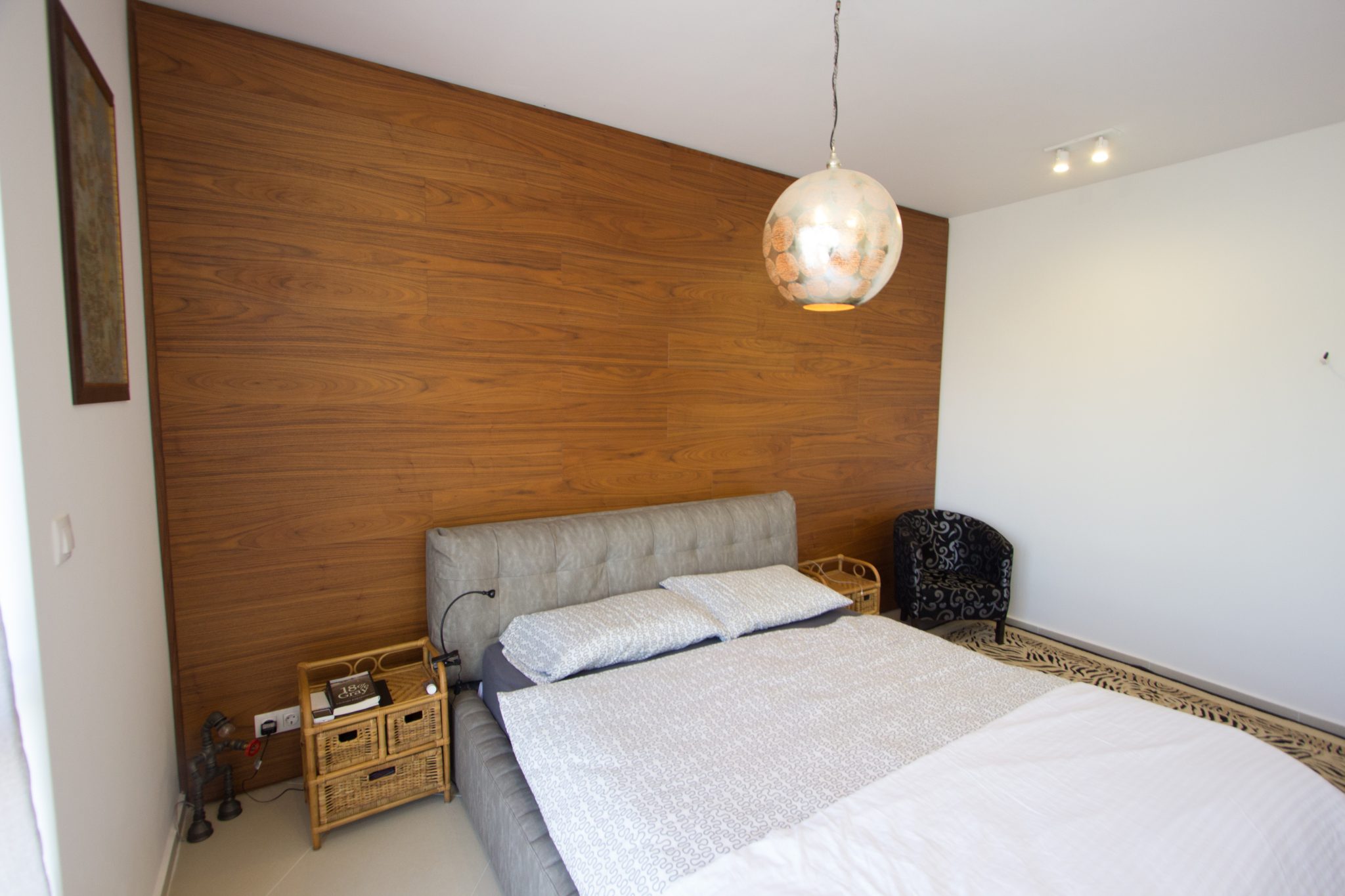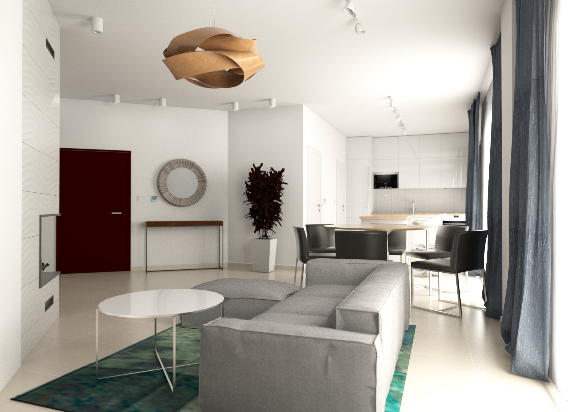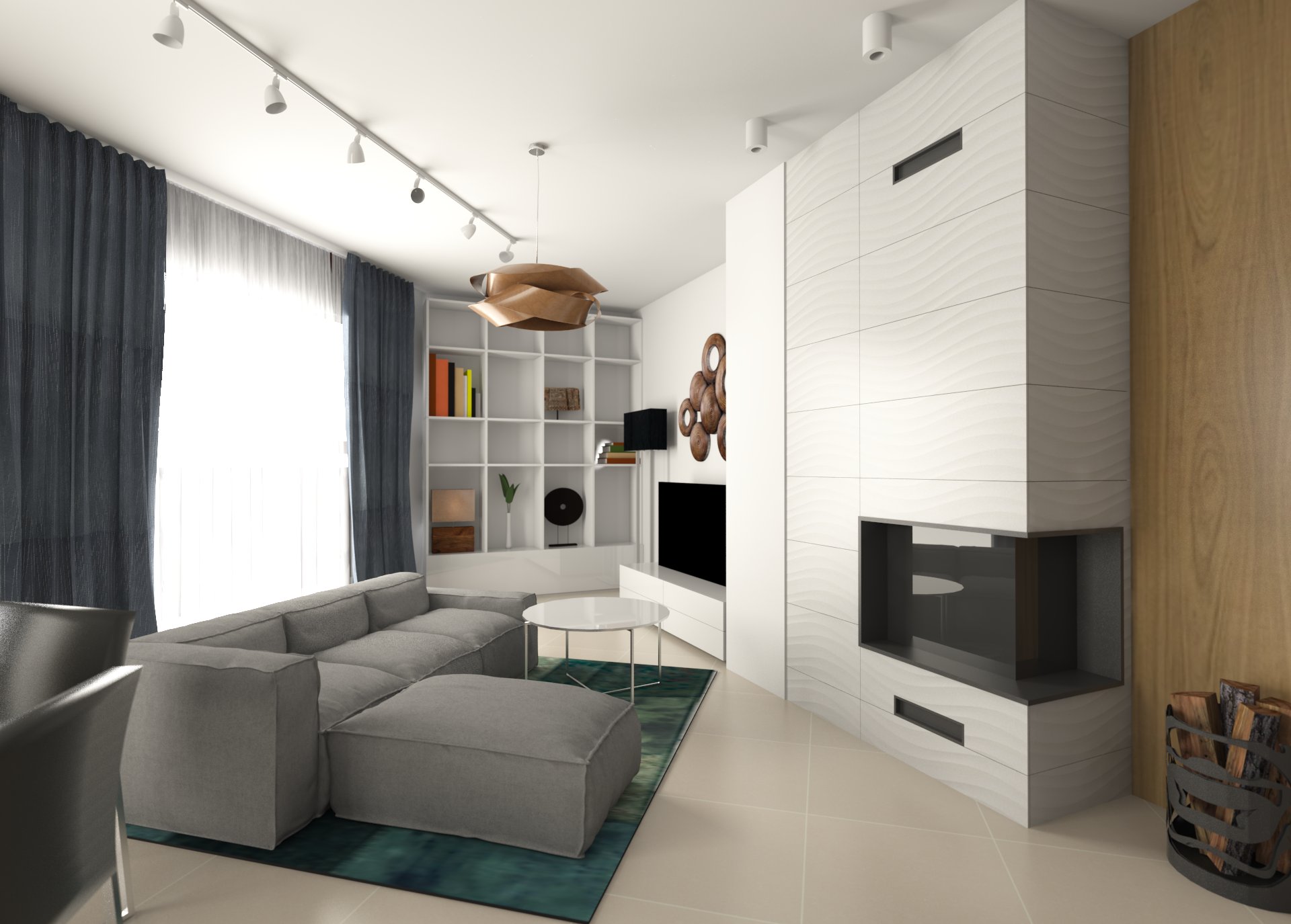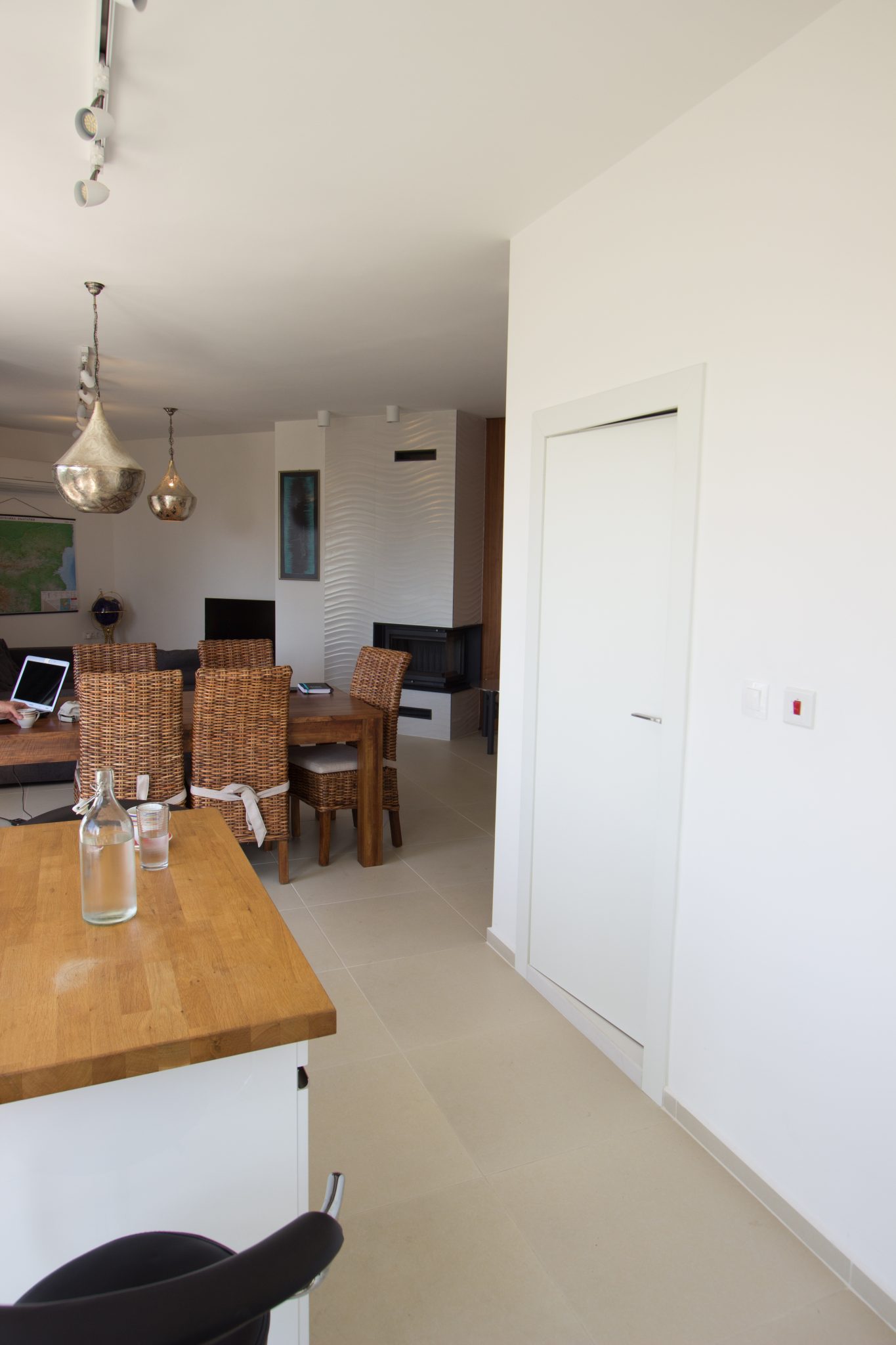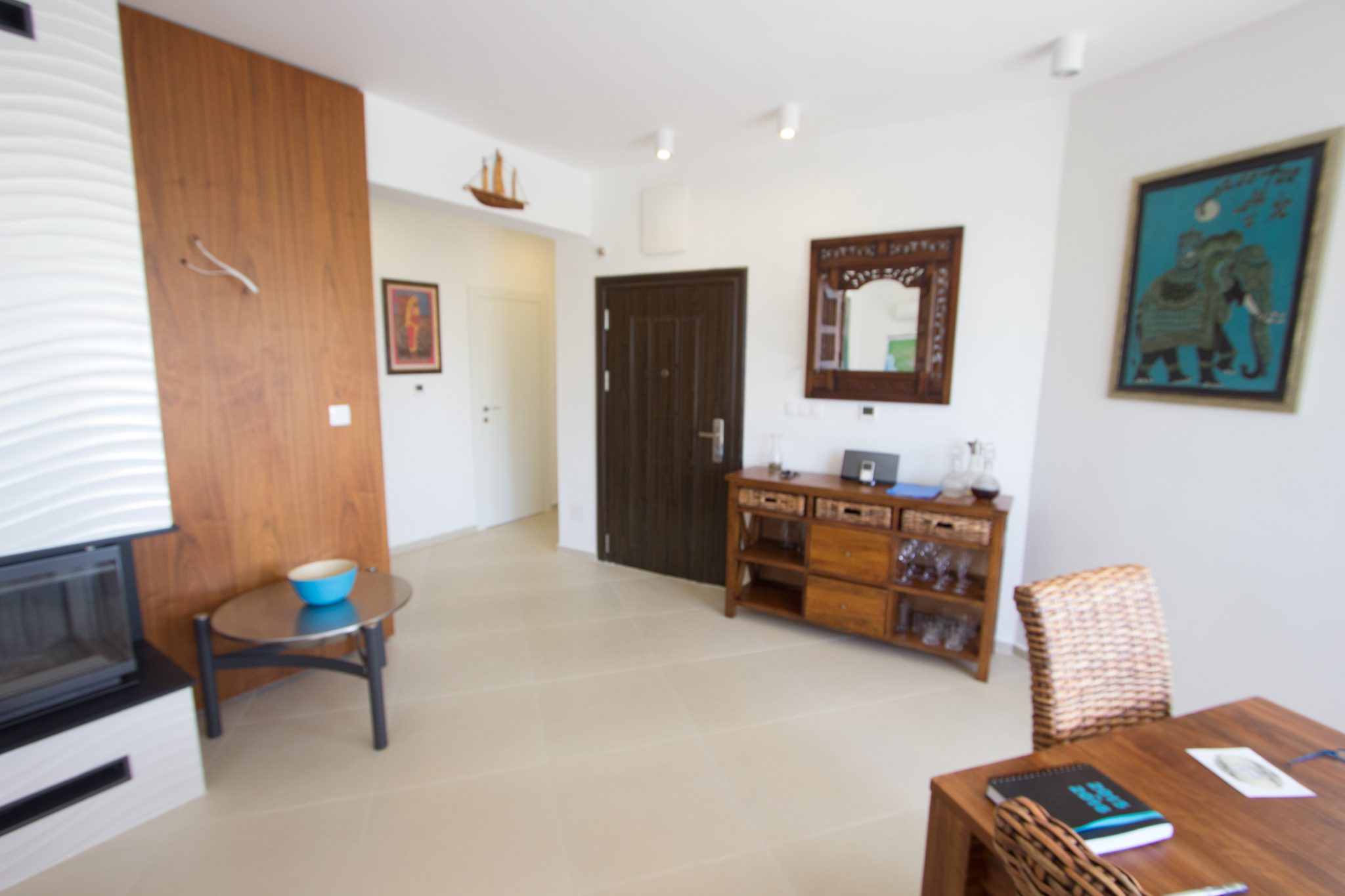 Main idea of the project was to develop modern vacation retreat for the homeowners – a young family of travelers. We decided to create balanced and peaceful atmosphere serving comfort and relaxation. To provide mind and physical relief we have chosen the earthy tones of the sand as a concept for the floor coverings mixed with wood accents as wall paneling. Аll this blended in natural textures, clear lines and simplicity – beige, white, light brown tones, high gloss mirrored surfaces, chrome metal details; natural wood, steel blue color, graphite and magma stone as finishes of bathrooms and toilets. The key materials included in the scope of the project are oak and iroko wood, veneered MDF american walnut, chrome and stainless steel. We equipped the living area with wonderful fireplace thus emphasized peacefulness and warmth.